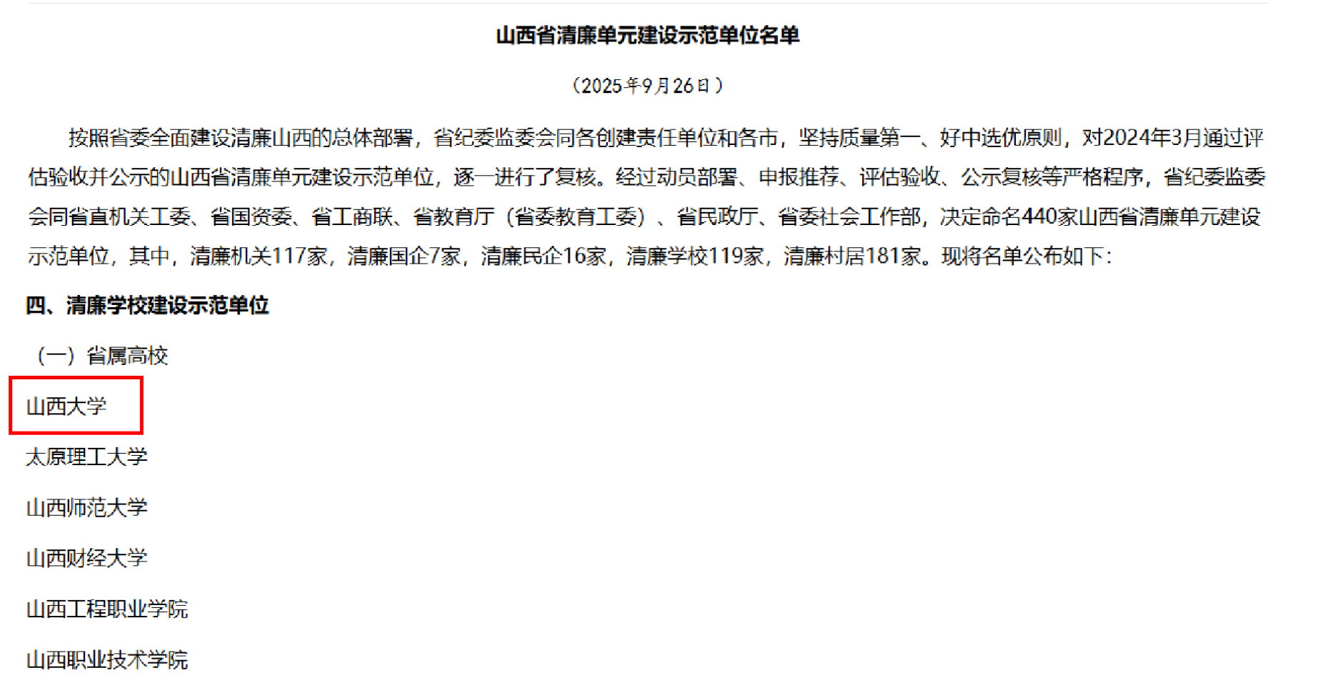 据悉,本次命名的440家山西省清廉单元建设示范单位中,包括清廉机关117家,清廉国企7家,清廉民企16家,清廉学校119家,清廉村居181家。